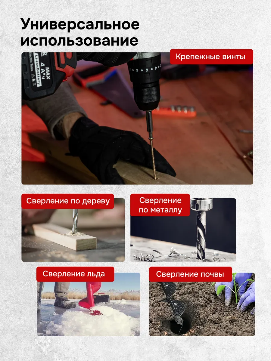 Благодаря нашему аккумуляторному шуруповерту, вы можете свободно работать в любом уголке вашего дома или в местах без электричества. Зимней порой облегчите себе задачу сверления в замерзших поверхностей или используйте как бур для рыбалки. Отличный подарок для рыбака