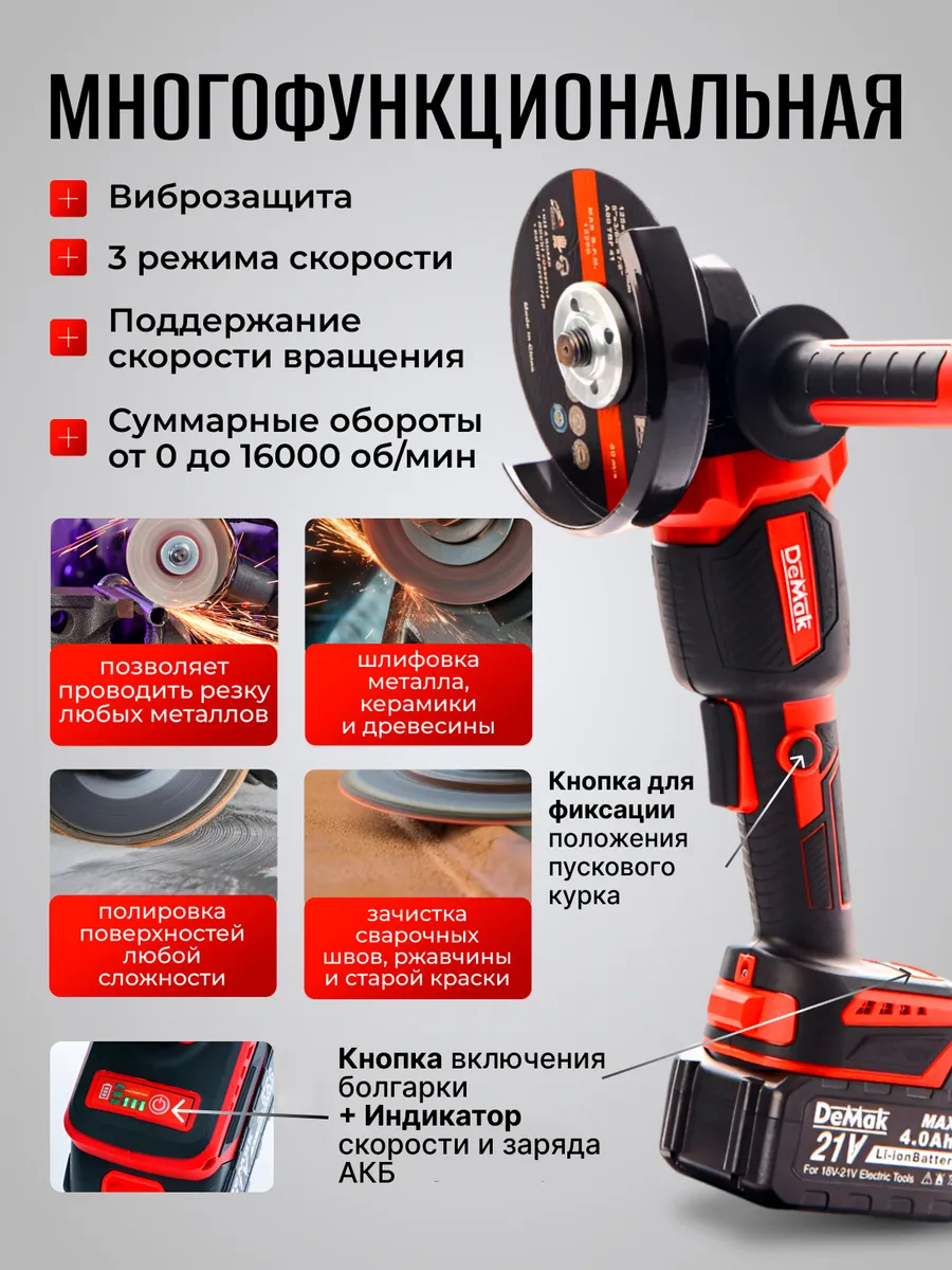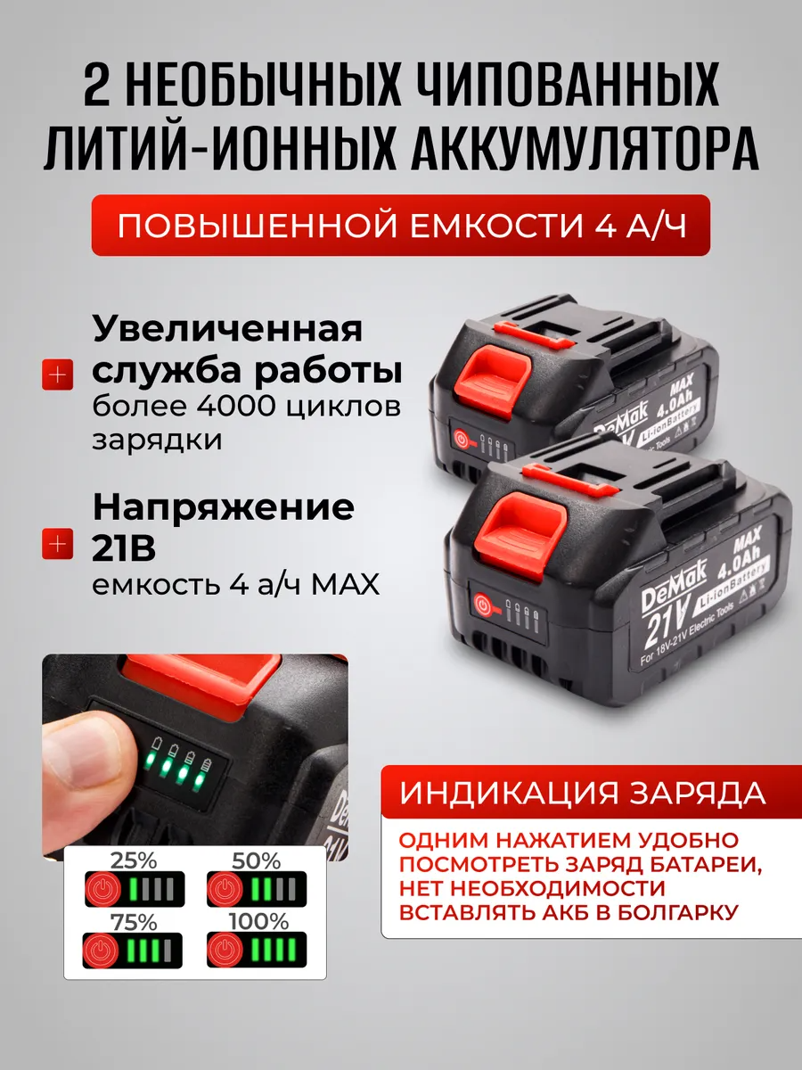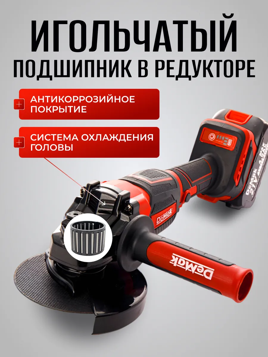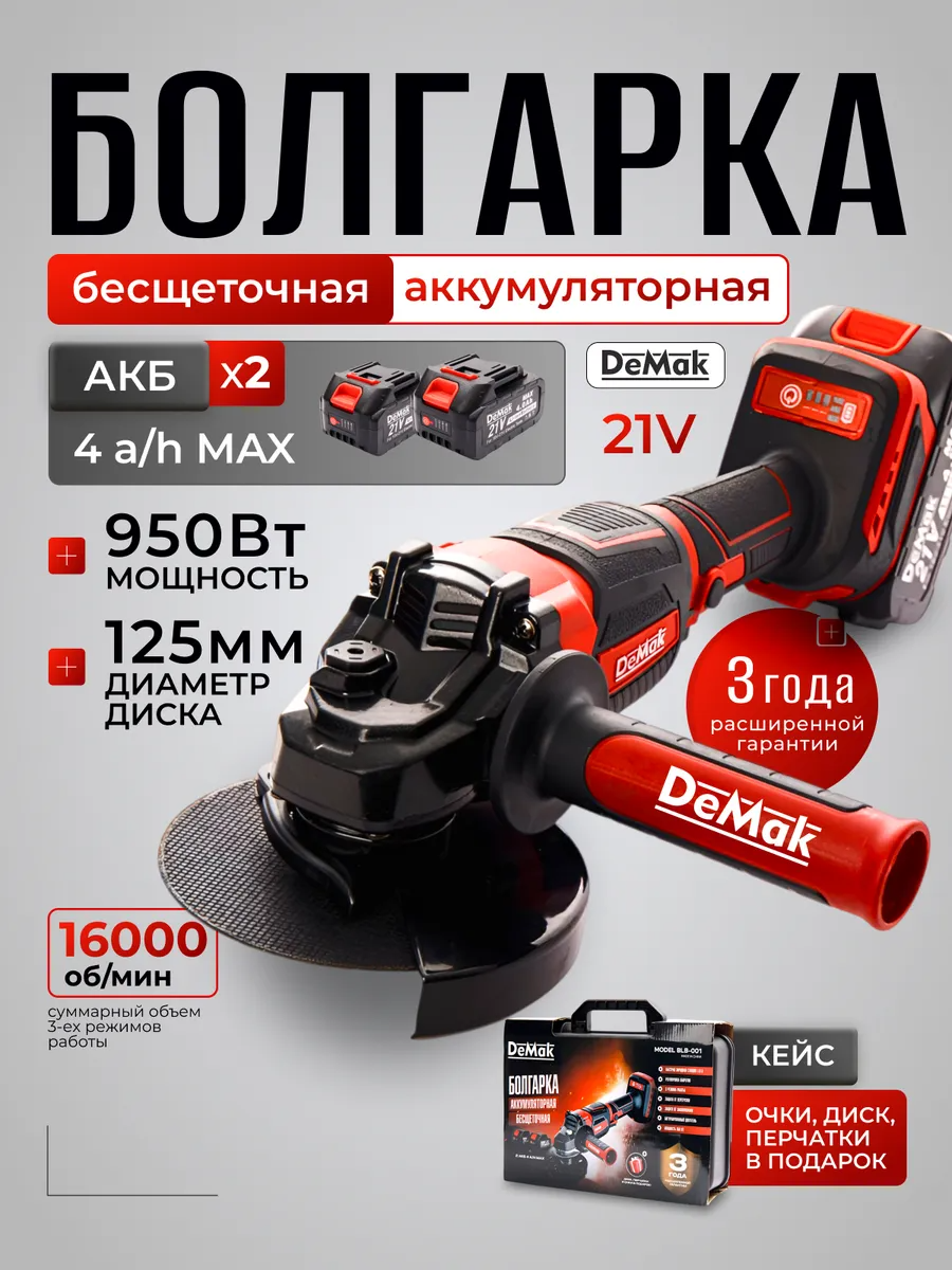 Описание Угловая аккумуляторная ушм бесщеточная DeMak — это профессиональная, надежная и долговечная болгарка. В набор входит 2 Li-Ion аккумулятора 24В и зарядное устройство. Акб не требует какого-либо обслуживания в течение всего срока эксплуатации. Преимуществом является электрический бесщеточный двигатель, который быстро развивает максимальную скорость оборотов за счет своего строения. В бесщеточных двигателях отсутствует искрообразование.
