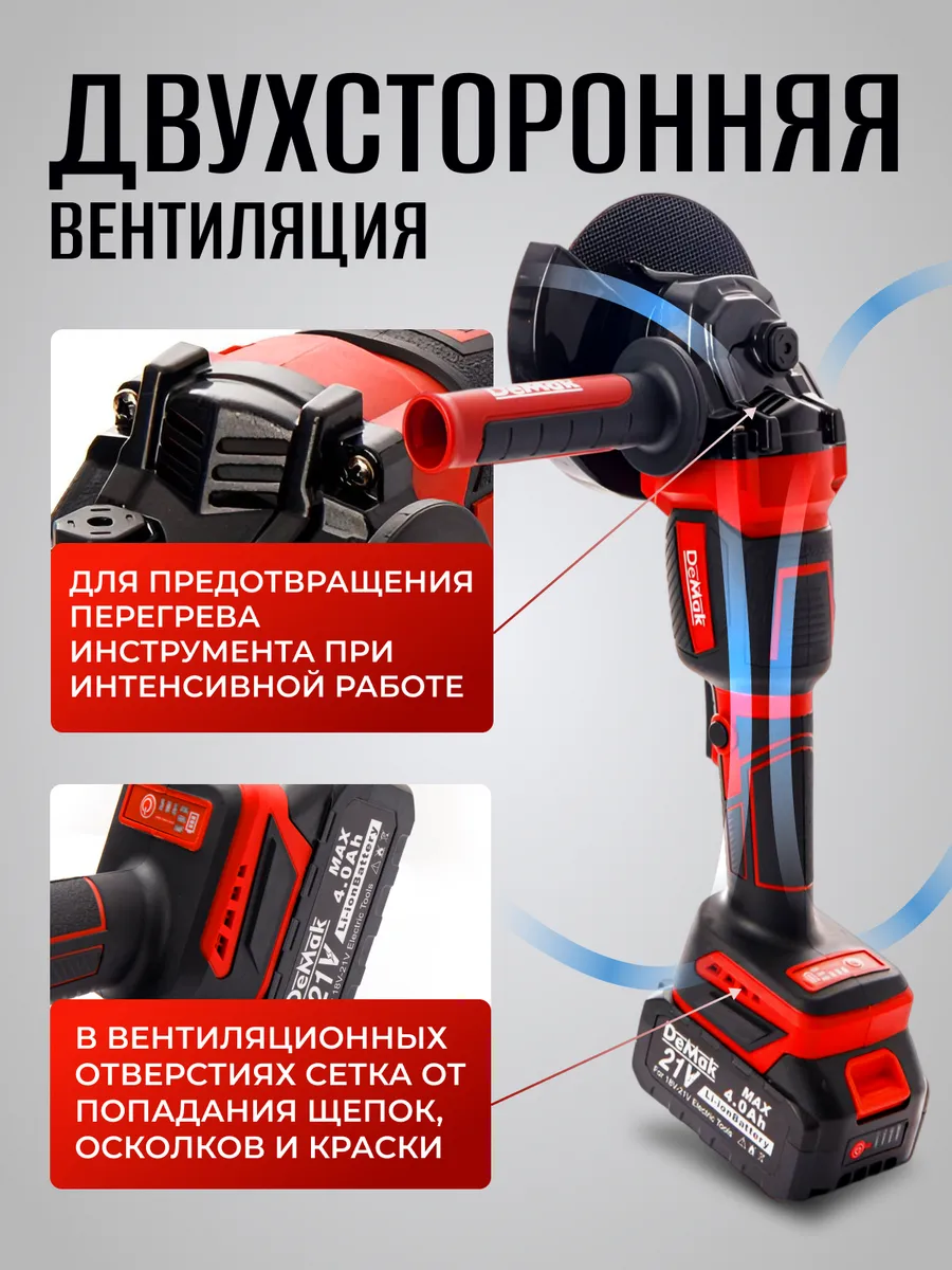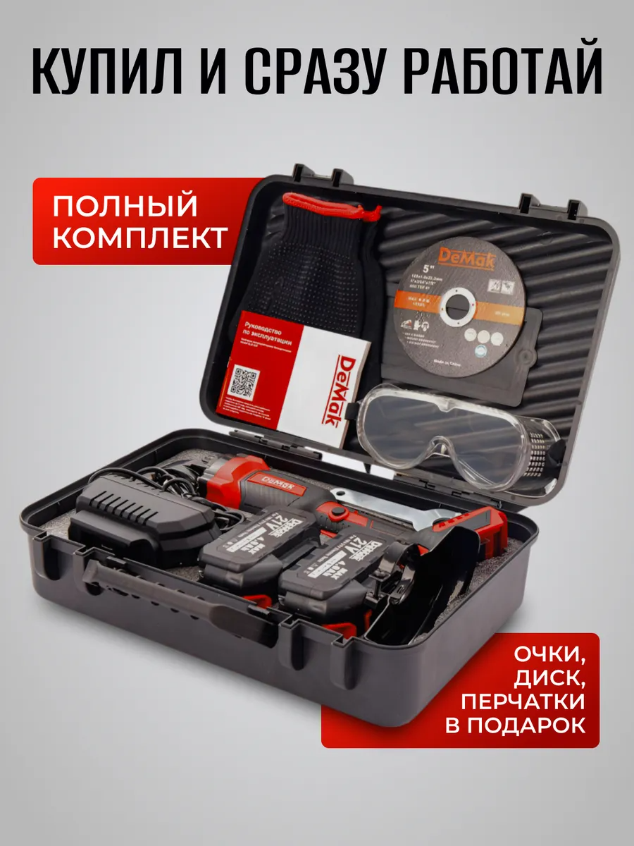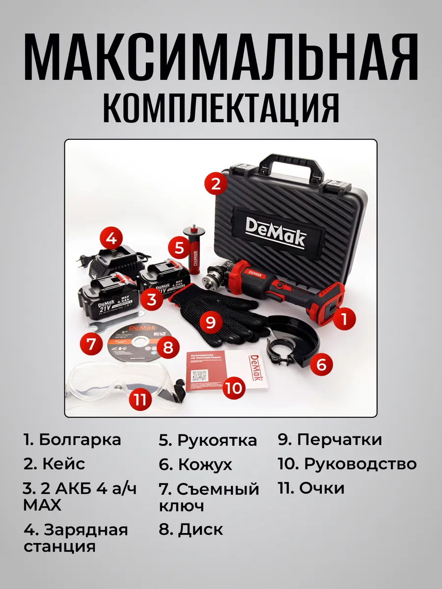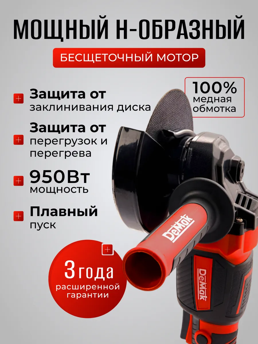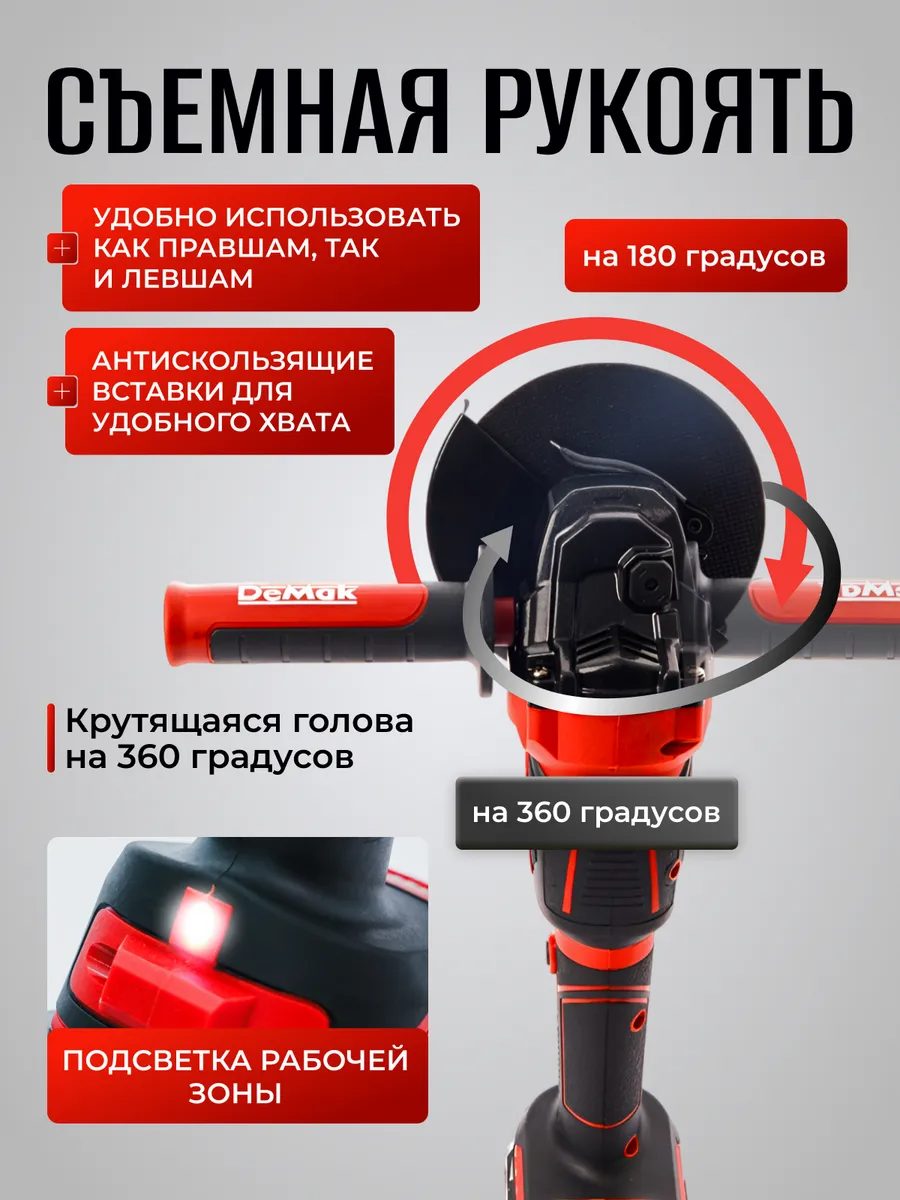 Описание Угловая аккумуляторная ушм бесщеточная DeMak — это профессиональная, надежная и долговечная болгарка. В набор входит 2 Li-Ion аккумулятора 24В и зарядное устройство. Акб не требует какого-либо обслуживания в течение всего срока эксплуатации. Преимуществом является электрический бесщеточный двигатель, который быстро развивает максимальную скорость оборотов за счет своего строения. В бесщеточных двигателях отсутствует искрообразование.