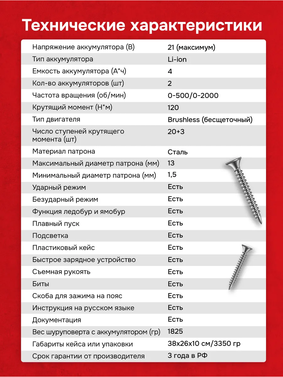 Описание Шуруповерт аккумуляторный бесщеточный электроинструмент для множества строительных и ремонтных задач! Дрель шуруповерт незаменимый строительный инструмент в руках профессионала и любителя. Аккумуляторный шуруповерт – это производительность и удобство