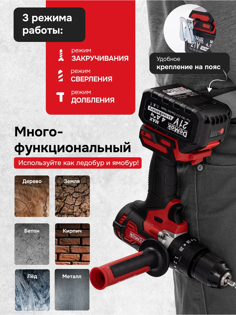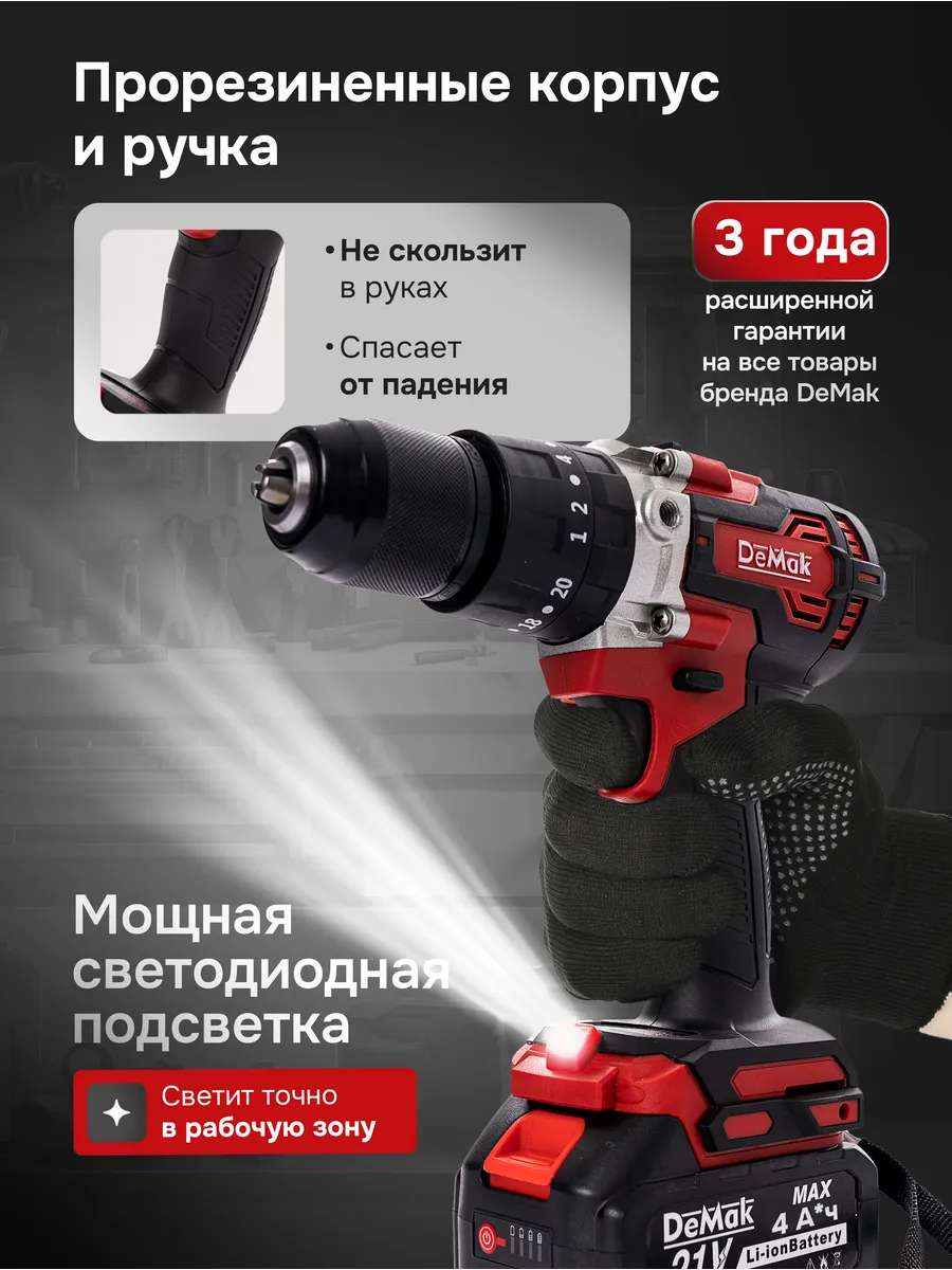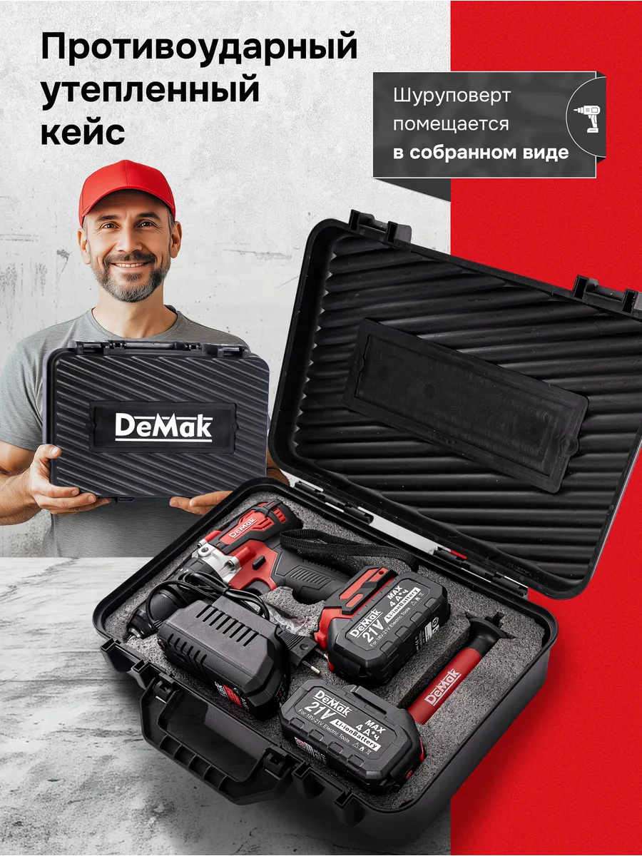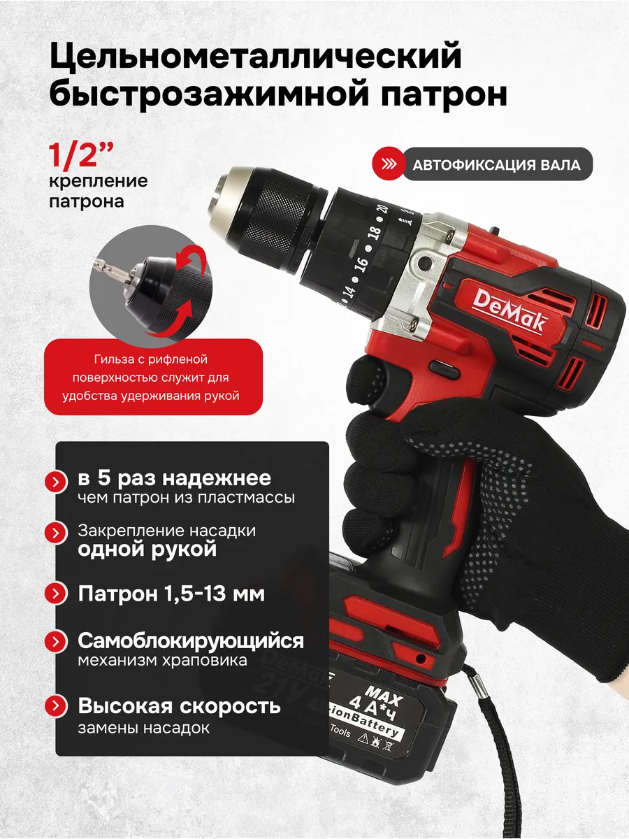А также! И шуроповерт идеален для бурения ям! Дрель DeMak с мощным двигателем класса, шуруповерт makita, гарантирует быстрое и глубокое сверление в различных материалах – от дерева до железобетона. Дрель электрическая имеет расширенную комплектацию: прорезиненная рукоятка, 2 АКБ типа makita, зарядное устройство, скоба для зажима на пояс, инструкция на русском языке. Кейс для инструмента ударопрочный.