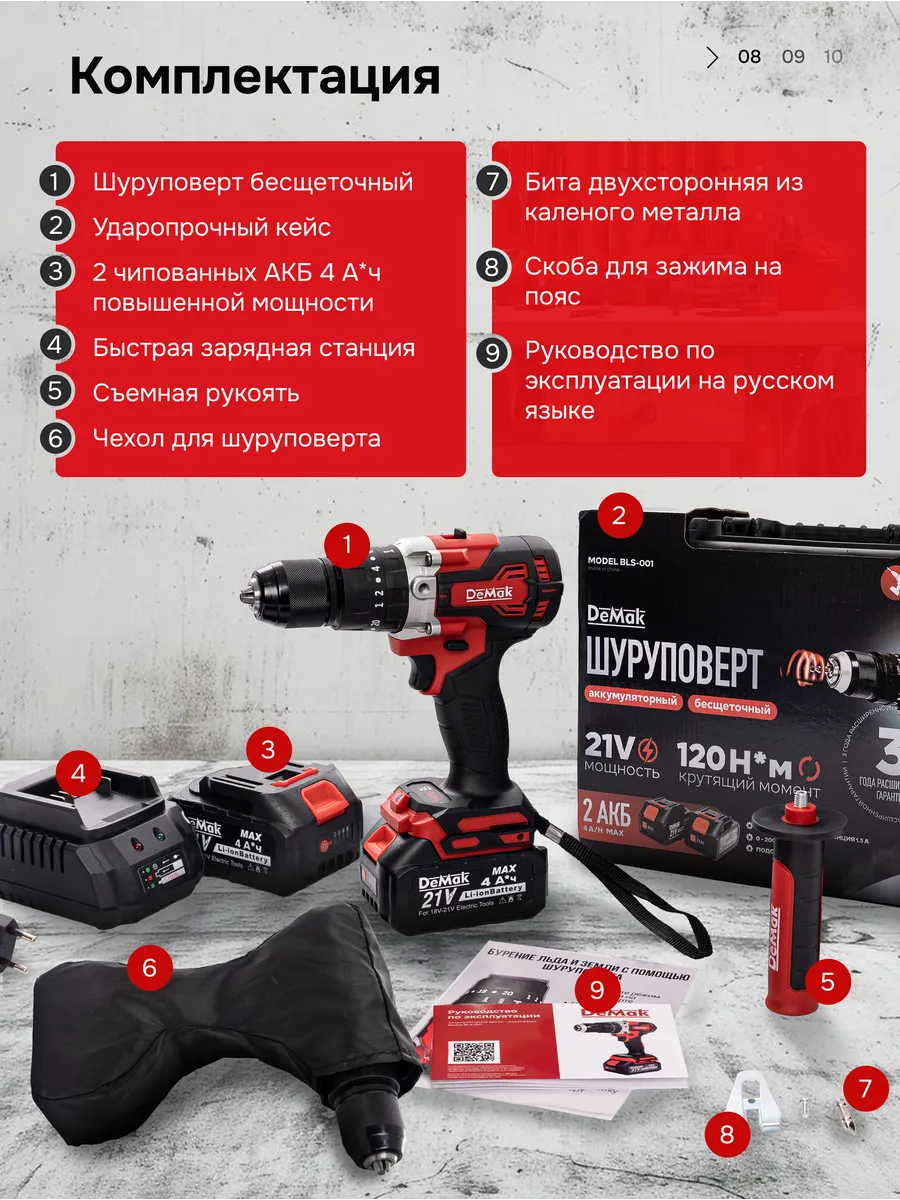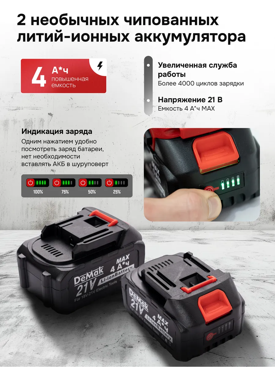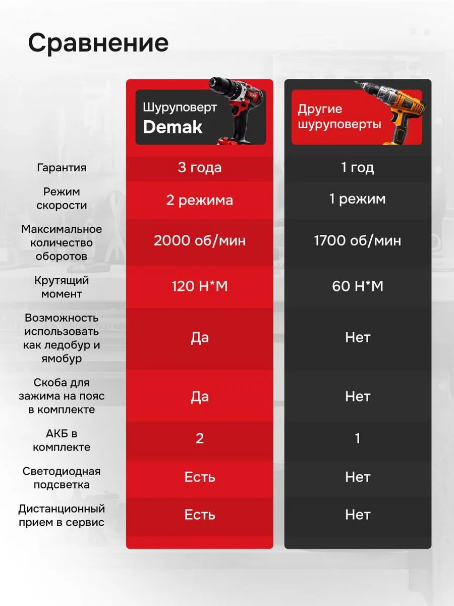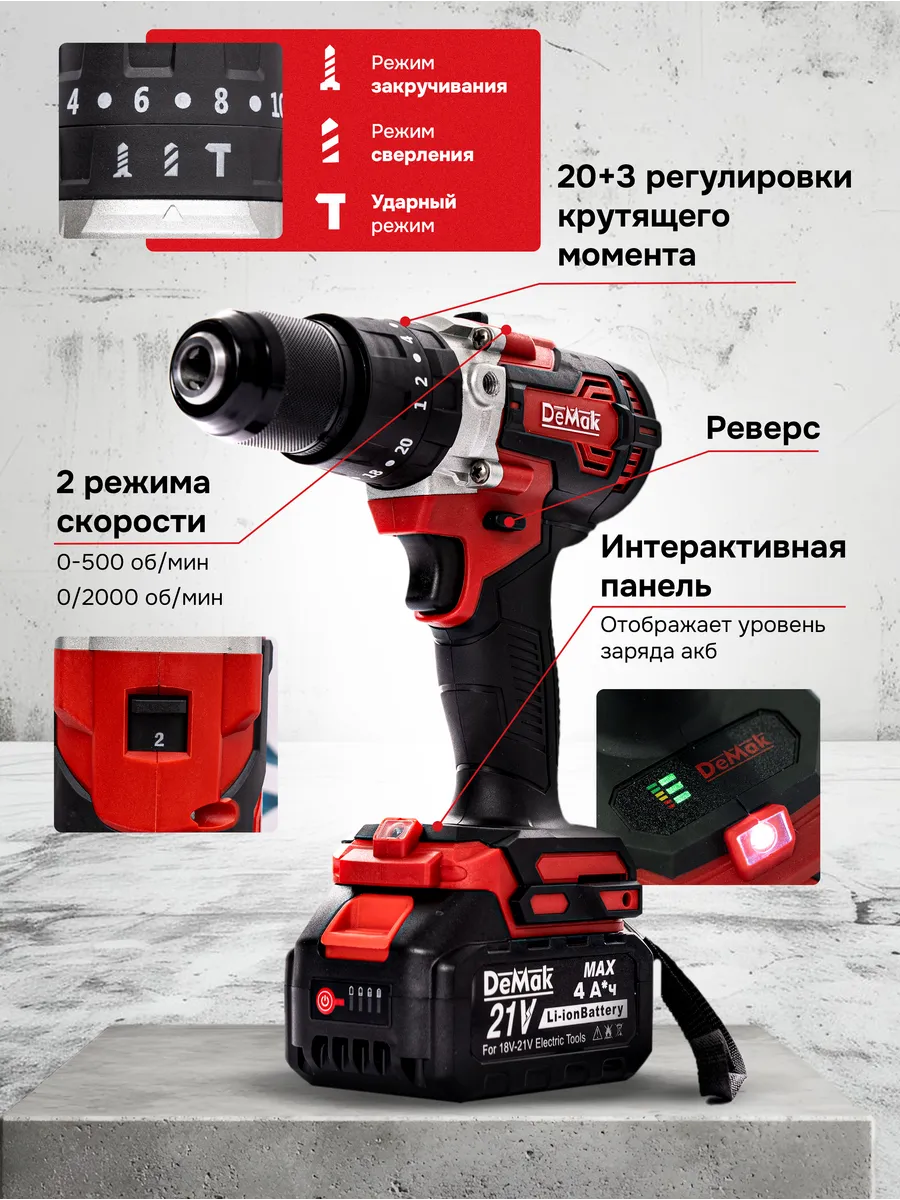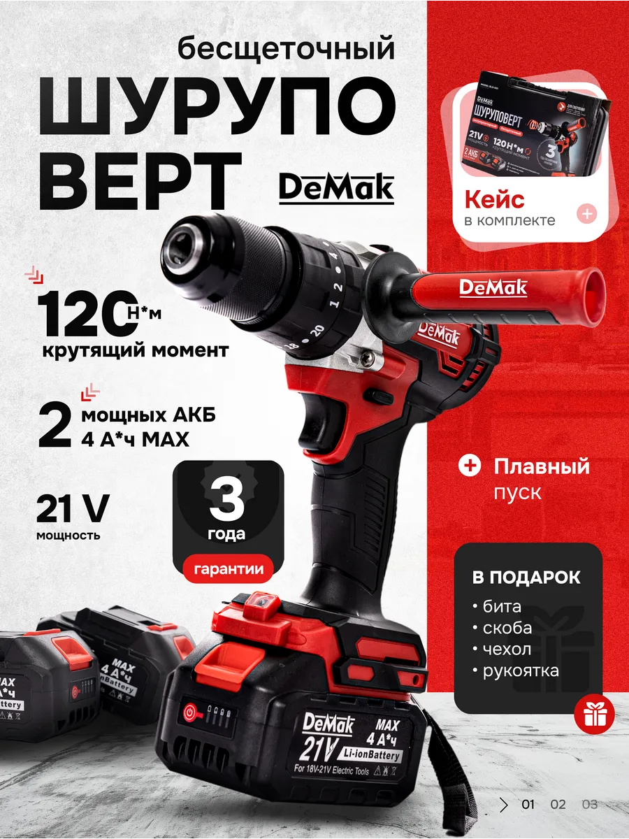 А также! И шуроповерт идеален для бурения ям! Дрель DeMak с мощным двигателем класса, шуруповерт makita, гарантирует быстрое и глубокое сверление в различных материалах – от дерева до железобетона. Дрель электрическая имеет расширенную комплектацию: прорезиненная рукоятка, 2 АКБ типа makita, зарядное устройство, скоба для зажима на пояс, инструкция на русском языке. Кейс для инструмента ударопрочный.