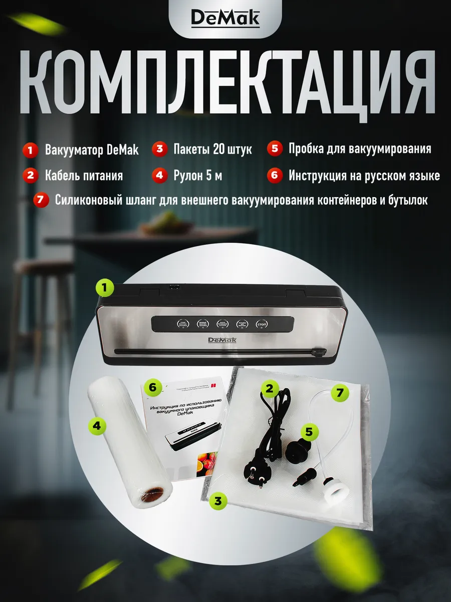 Описание Вакууматор для продуктов идеальная техника для кухни. Необходим в каждом доме для хранение продуктов. Этот мощный вакууматор позволяет продлить свежесть еды. С помощью упаковщик вакуумный вы с легкостью создадите пищевой вакуум, который защитит ваши продукты от воздействия воздуха и влаги.