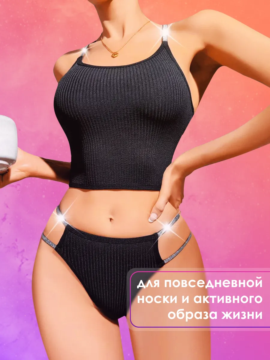 Описание Оригинальный комплект нижнего белья от бренда Fyr-Fyr выполненный в утонченном черном цвете с блестящими серебряными вставками, станет неотъемлемой частью базового женского гардероба. Топ на стильных и удобных бретелях и трусики из дышащей ткани в рубчик. Топик и стринги оснащены усиленным эластичным поясом в виде компрессионной резинки. Благодаря наличию тонких лямок и утягивающей резинки по низу, лифчик хорошо поддерживает маленькую грудь, что хорошо подойдет как для женщин, так и для девушек. Трусы с утяжкой живота оснащены ластовицей, состоящей из натурального хлопка - это обеспечивает комфортную посадку и хорошо пропускает воздух, предотвращая натирание нежных интимных зон. Удобные трусики обеспечивают комфорт и свободу движений, идеально сидят на любой посадке. Нательное белье отлично подойдет для беременных и кормящих женщин, ведь чувствовать себя привлекательной важно женщине в каждом периоде ее жизни, также, благодаря широкой размерной сетке подобрать для себя комплект смогут женщины от маленьких до больших размеров, мы изготавливаем одежду для стройных и полных девушек, девочек и женщин. Бюстгальтер на бретельках и плавки с завышенной талией красиво подчеркивают силуэт, а качество пошива не оставят вас равнодушными. Комплект идеально подходит для любого времени года и спортивных активностей, благодаря своему легкому и дышащему материалу. Эта базовая вещь в повседневном гардеробе настоящих модниц. Белье с корректирующим эффектом выделит чувственные линии вашего тела. Нижнее белье упаковано аккуратно и бережно, что гарантирует сохранность набора. Это не бесшовное спортивное белье без косточек, а корректирующий комплект с бюстгалтером и трусами. Трусы не впиваются в тело. Красивый комплект нижнего белья - это отличный подарок на Новый год, подарок на 8 марта, подарок на День рождения. Покупая продукцию Fyr-Fyr! Вы получите качественную продукцию и высокий сервис.