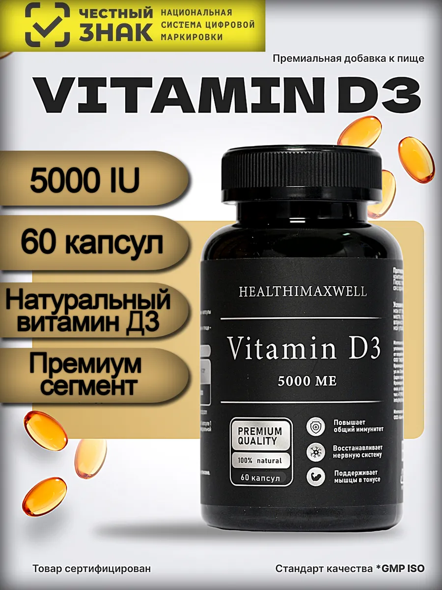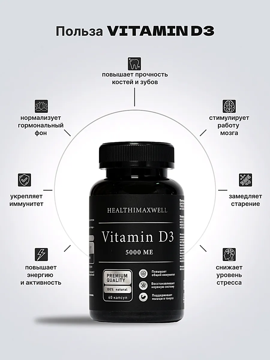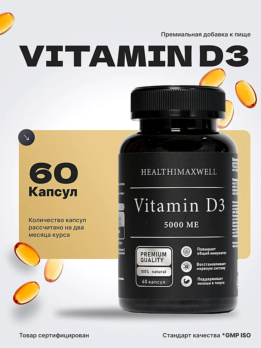 Описание Premium БАД "Витамины СТМ vitamin D3 5000 софтгель 60 капсул" (по одной капсуле в день) от бренда HEALTHIMAXWELL предлагает эффективное укрепление здоровья и поддержание нормального уровня витамина D3 в организме. Витамин D3 играет ключевую роль в формировании и поддержании костной ткани, способствует усвоению кальция и фосфора, что особенно важно для здоровья костей и зубов. Софтгель формат обеспечивает легкое проглатывание и максимальную абсорбцию активных веществ. Этот продукт подходит для людей, ведущих активный образ жизни, а также для тех, кто сталкивается с дефицитом витамина D3 из-за недостаточного пребывания на солнце. 60 капсул в упаковке обеспечивают достаточное пополнение запасов витамина D3 на длительный период.