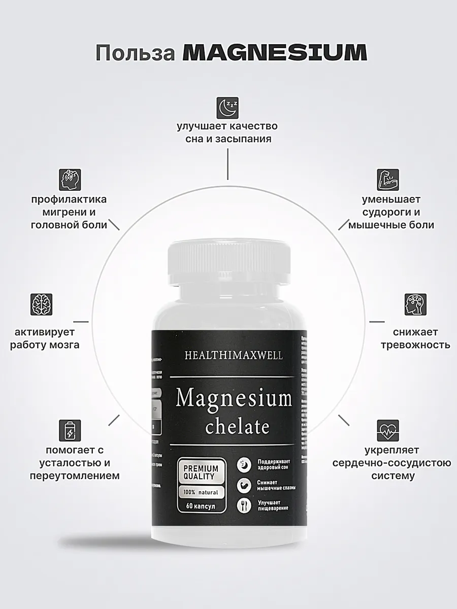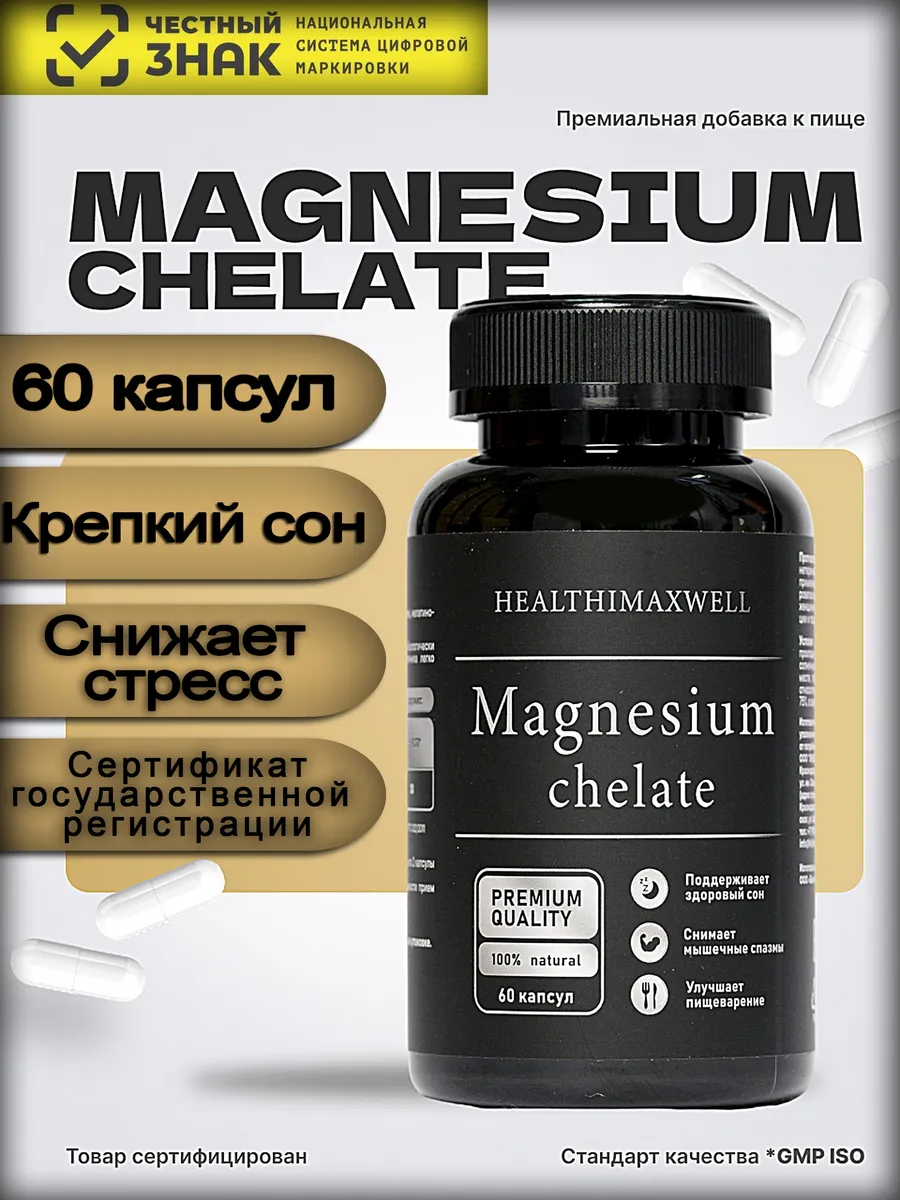 Описание Бад к пище "Магний хелат" от HEALTHIMAXWELL представляет собой высококачественный Premium комплекс, содержащий 60 капсул, специально разработанный для поддержания здоровья и благополучия организма. Магний, являясь одним из ключевых микроэлементов, играет важную роль в нормализации работы сердца, улучшении качества сна, крепкий сон, а также способствует уменьшению усталости и снижает стресс. Хелатная форма магния обеспечивает его высокую биодоступность и эффективность, позволяя организму легко усваивать и использовать этот элемент для выполнения его функций. Регулярное применение бада к пище "Магний хелат" способствует укреплению костей, улучшению работы нервной системы и общему улучшению самочувствия. Этот продукт идеально подходит для людей, ведущих активный образ жизни, а также для тех, кто стремится поддерживать свое здоровье на высоком уровне. Премиум сегмент.
