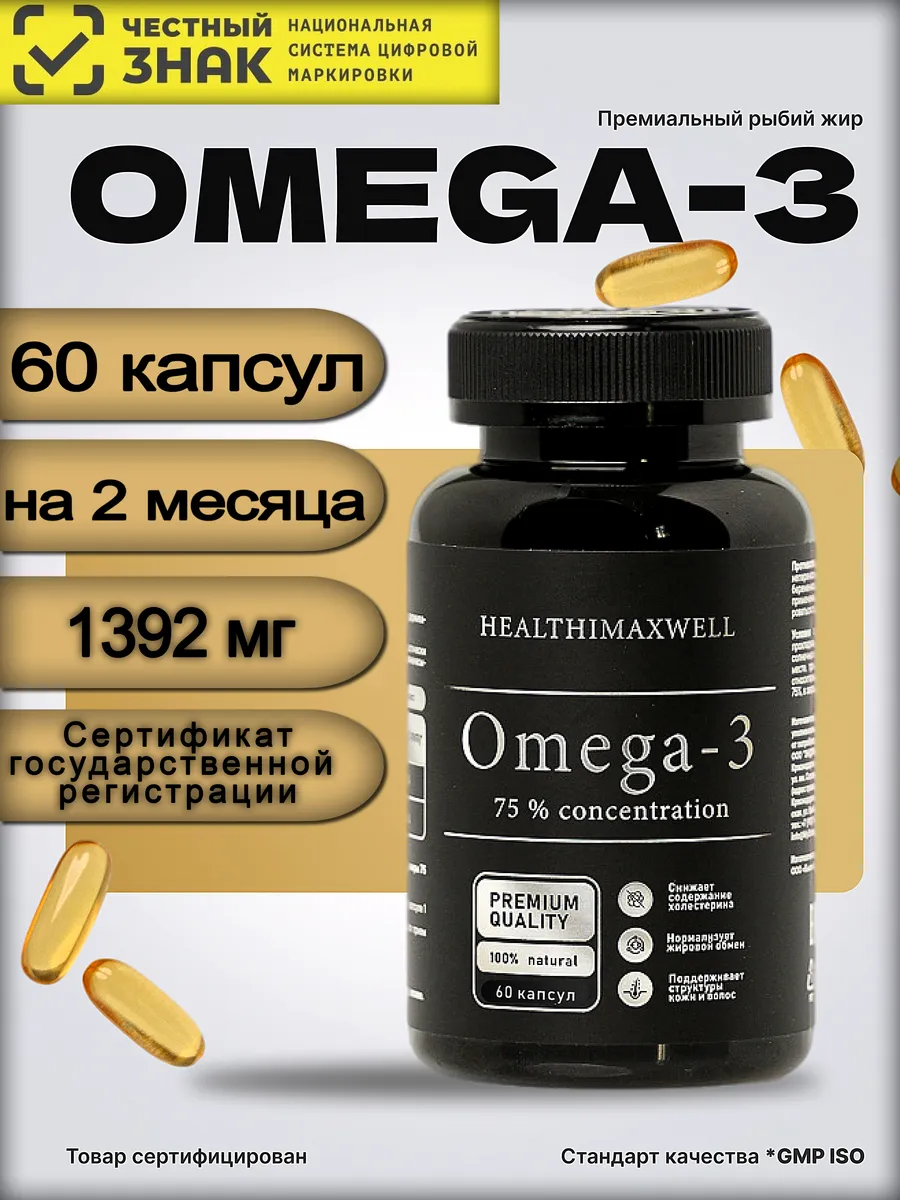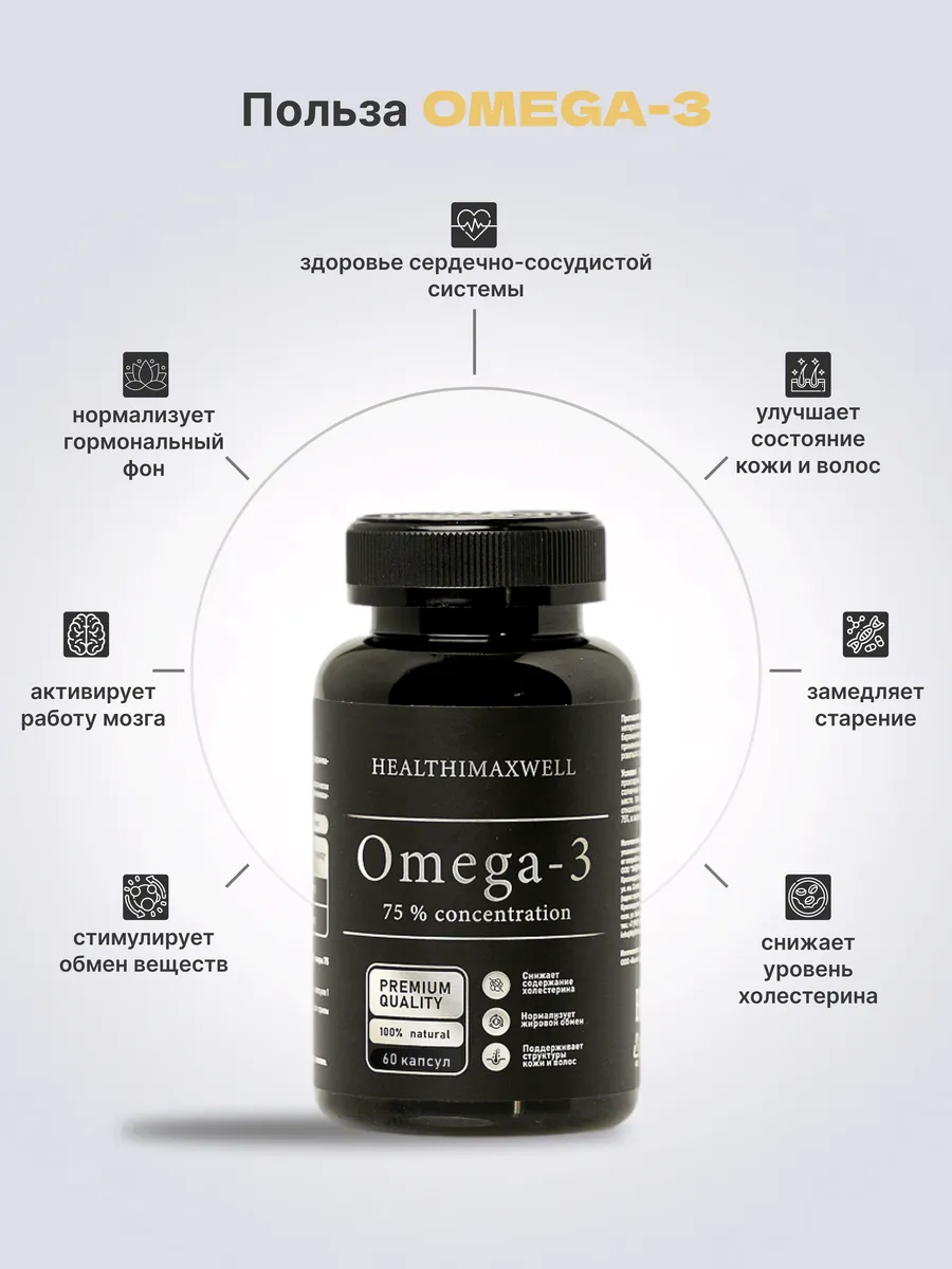 Описание Premium БАД Омега 3 "Антиоксидант СТМ Omega-3 75%" в капсулах (по одной таблетке в день, очень удобно) от HEALTHIMAXWELL представляет собой высококачественный комплекс рыбьего жира дикого камчатского лосося, предназначенный для укрепления здоровья и поддержания активности организма. Этот продукт содержит 75% чистого омега-3, что делает его одним из самых эффективных средств для поддержания здоровья сердечно-сосудистой системы, улучшения работы мозга и повышения общего уровня энергии. Хранение капсул в непрозрачной упаковке, что обеспечивает их свежесть и сохранность активных компонентов. Одной банки хватает на 2 месяца приема! Принимая регулярно Омега 3 "Антиоксидант СТМ Omega-3", вы помогаете своему организму бороться со свободными радикалами, предотвращаете окислительный стресс и способствуете долголетию , нормализует жировой обмен, снижает уровень холестерина и риск развития атеросклерозам. Этот БАД является идеальным выбором для тех, кто ценит свое здоровье и хочет поддерживать его на высоком уровне.