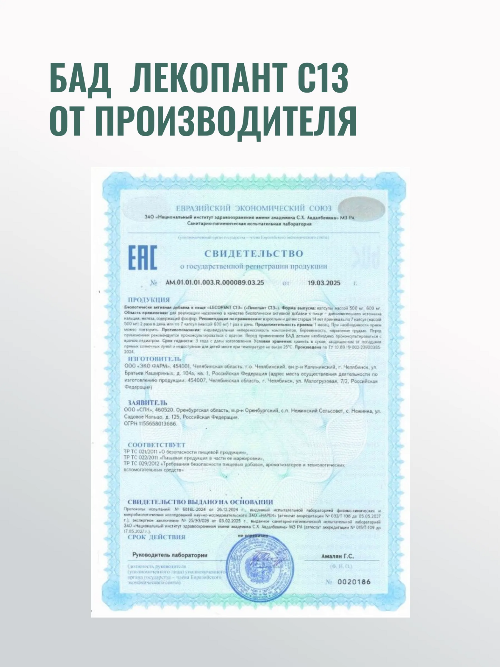 Дополнительная информация Количество капсул/таблеток - 60 шт. Назначение добавки - Тестостерон; для похудения; Для костей и суставов Страна производства - Россия Противопоказания - индивидуальная непереносимость; периоды беременности и лактации; онкология Форма выпуска - капсулы/таблетки Срок годности - 24 мес Комплектация - 60 капсул Максимальная температура хранения - 25 Торговое наименование - Биологически активная добавка к пище «LECOPANT C13» («Лекопант С13»)