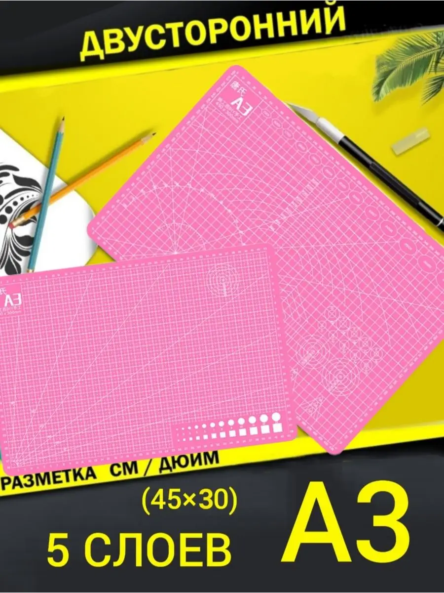 Описание Двусторонний 5-слойный коврик (мат) для резки и раскройных работ формата А3 предназначен для защиты рабочей поверхности от порезов, а также удобства при работе с бумагой и тканями. На верхний самовосстанавливающийся слой нанесена сантиметровая и дюймовая разметка, промежуточный мягкий слой защищает ножи от затупления, средний, самый жесткий слой не позволяет коврику прорезаться насквозь. Двухцветное покрытие коврика матовое нескользящее, приятных цветов, комфортных для глаз. Чтобы снизить нагрузку на глаза, советуем чаще переворачивать рабочую поверхность (менять цвет) коврика. Незаменимая вещь для людей, занимающимися скрапбукингом, квиллингом, шитьем, пэчворком, моделированием и т.д. Чтобы продлить срок службы мата постарайтесь беречь его от воздействия прямых солнечных лучей. Это общее правило для матов такого типа! Самовостанавливающися коврик для резки ножей, инструмент для рукоделия и шитья, творчества. Для бабушки женский. Различные размеры А1, А2, А3, а4. Удобно использовать на столе или парте, на коврике присутствует линейка, клетка. Используется так же для резки ткани и кожи. Защитный прорезиненный самовостанавливающийся мат. Отлично подойдет для рабочего стола, для рисования, квиллинга, моделирования. Форма прямоугольная. На нем используют ножницы, скальпель. Материал резиновый ПВХ. Коврик можно положить на стол для шитья. Это отличный коврик для творчества на стол. Кожаный коврик на стол, резка по нему отлично. razka, мягкий коврик не круглый. Так же для коврика подойдет нож для раскройки. Так же можно его использовать как коврик для рисования на стол. Наш коврик отличный инструмент для рукоделия. Коврик из каучука. Коврик подойдет на парту. Каучуковый коврик.