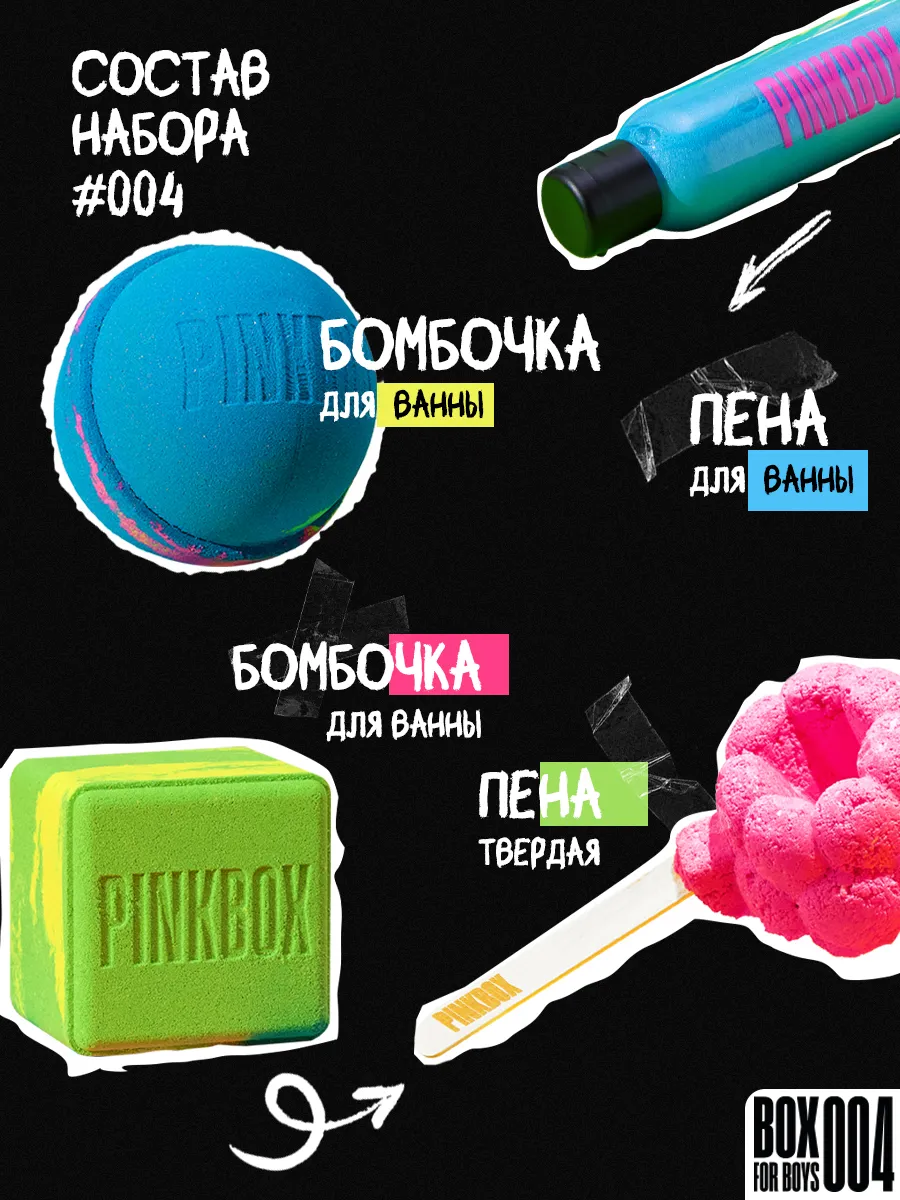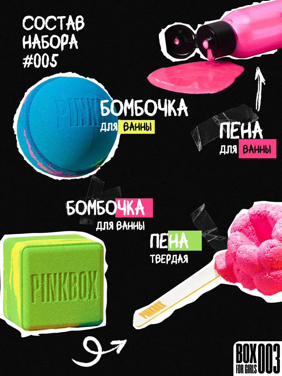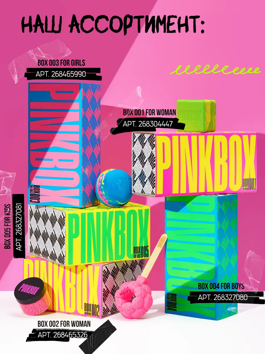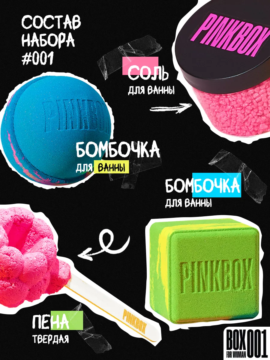 Каждый элемент набора создан с заботой о вашем комфорте и удовольствии. Подарите себе или своим близким незабываемые моменты расслабления и радости с набором бомбочек от PINKBOX!
