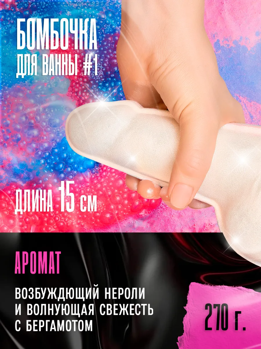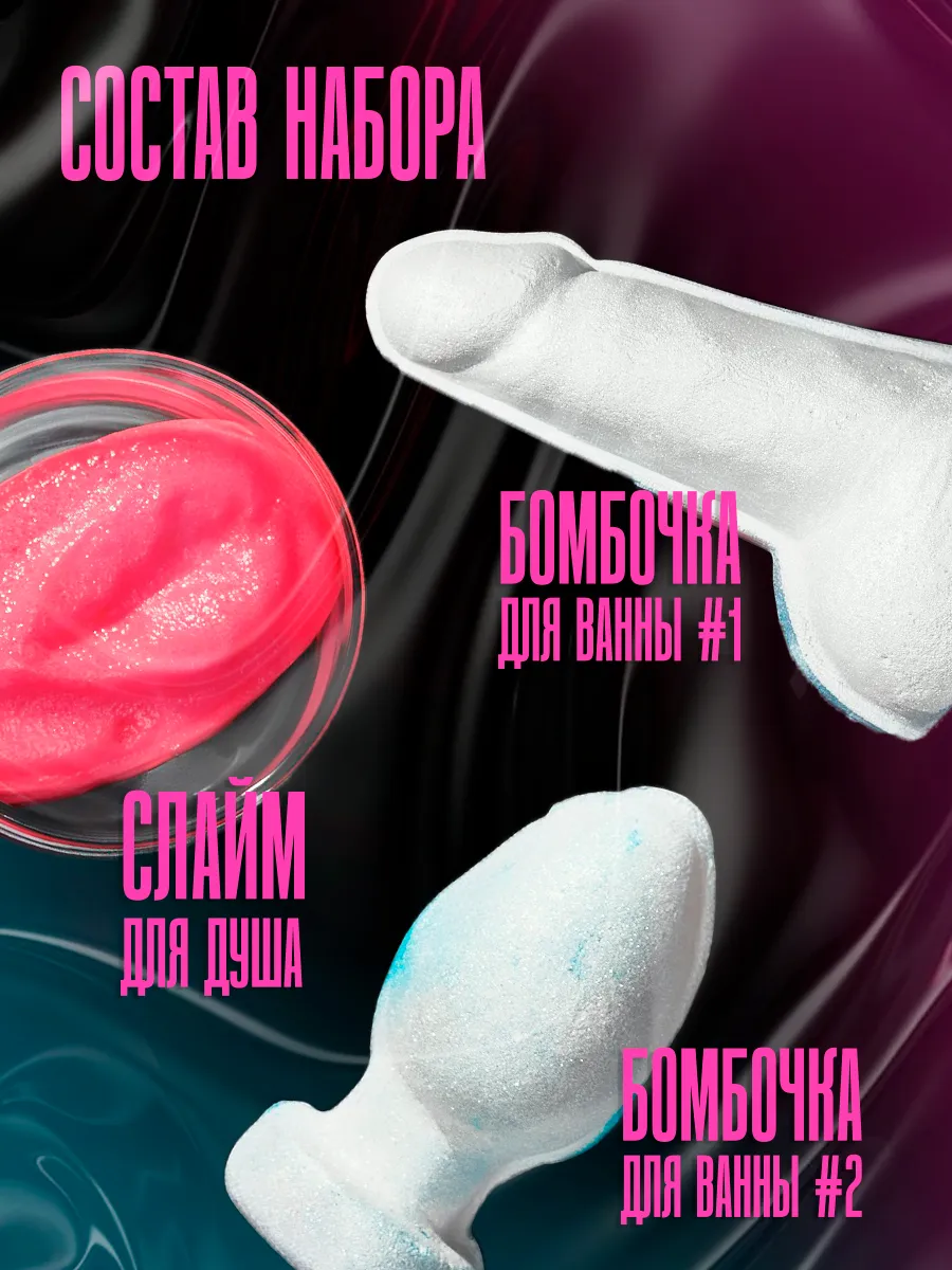 В набор входят: 1. Бомбочка для ванны в форме мужского полового члена 270 г Эта бомбочка, созданная из натуральных компонентов, таких как сода, лимонная кислота и молочный порошок, подарит вам незабываемые моменты расслабления. Просто растворите её в теплой воде и наслаждайтесь волшебной атмосферой!